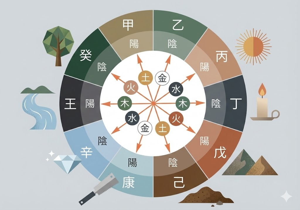 各柱に「十干」と「十二支」を配し、それらが持つ五行(木火土金水)のエネルギーバランスや相互作用(相生・相剋)を読み解きます。個人の先天的資質や社会運、運気のバイオリズムを論理的に体系化した、統計的側面を持つ運命学です。
